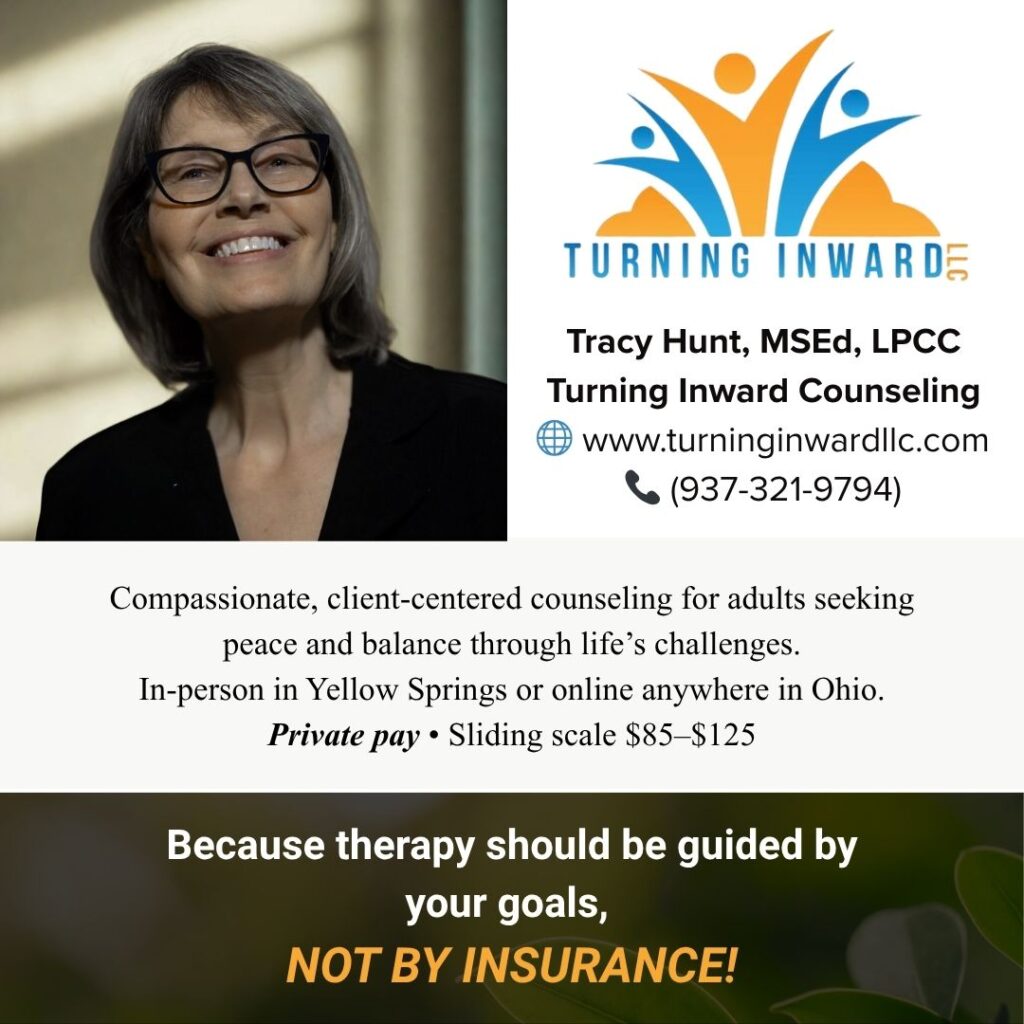 Turning Inward LLC, located at 100 Corry St, Yellow Springs, OH 45387, has been in business since 2017. As a solopreneur, Tracy Hunt (MSEd, LPCC) offers a compassionate, tailored therapy space for adults who are ready to turn inward, explore change, and strengthen emotional well‑being.