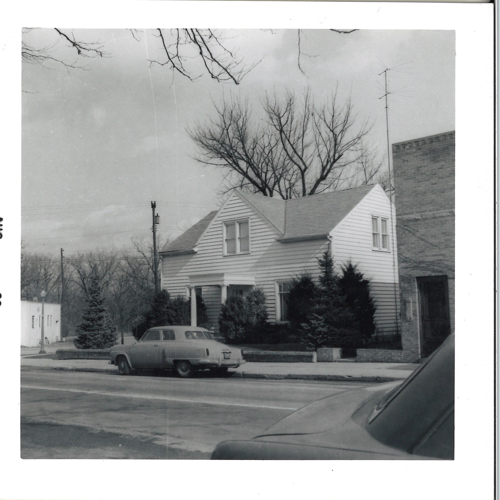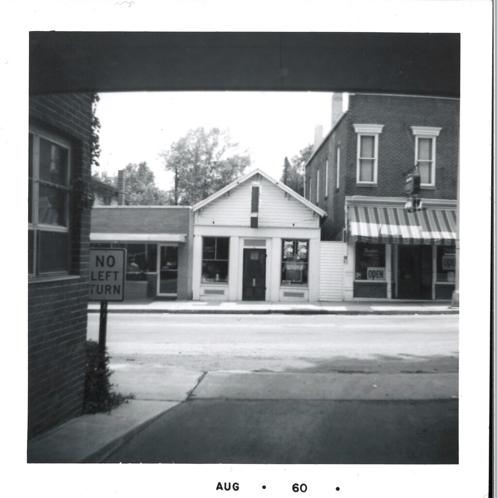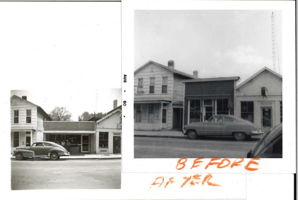 The location depicted in this before-and-after pair is where Tweedle D’s sits today. Then, it housed Gegner Barbershop, the site of an important protest for the town when Lewis Gegner was the only business owner left who refused to serve the Black community. His shop closed down in 1964. Similar to (Furay Rexall Drugs Before & After), the writer of the words “before” and “after” are unknown. To the right of Gegner’s is a dentist, and to the left is D&G Appliances.