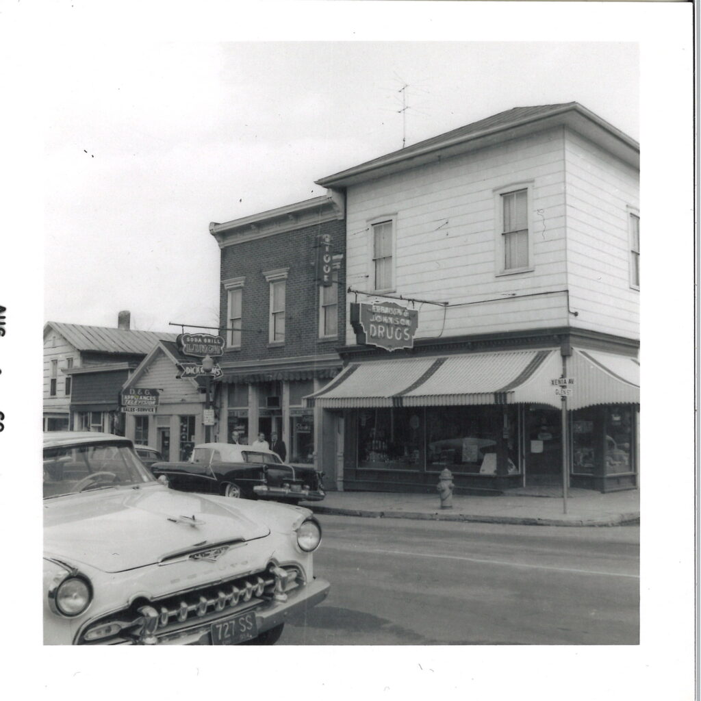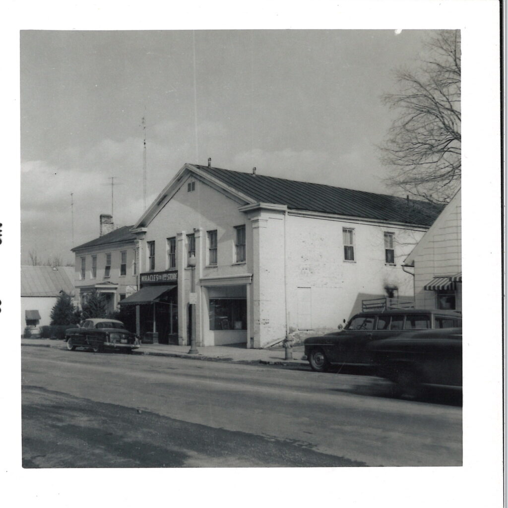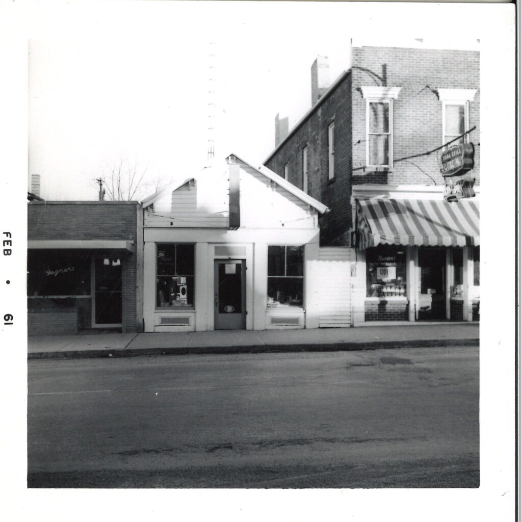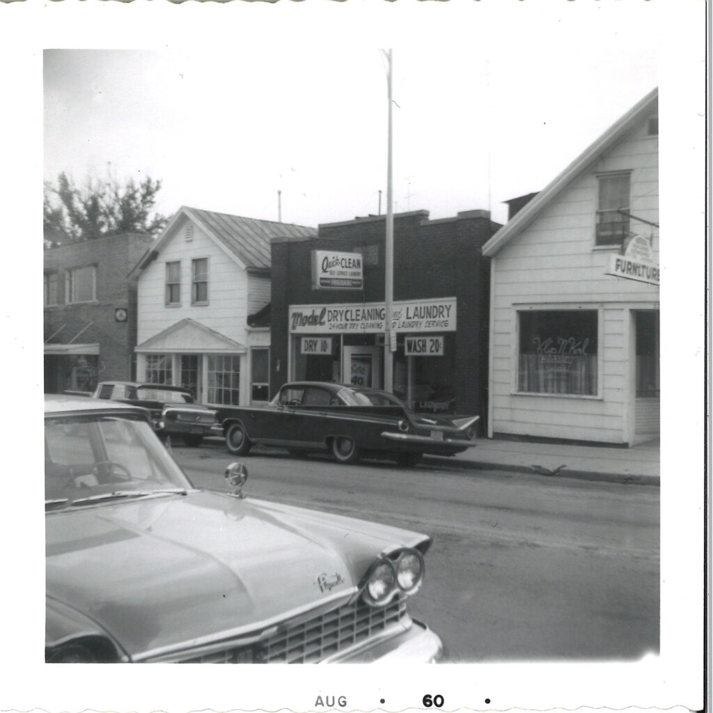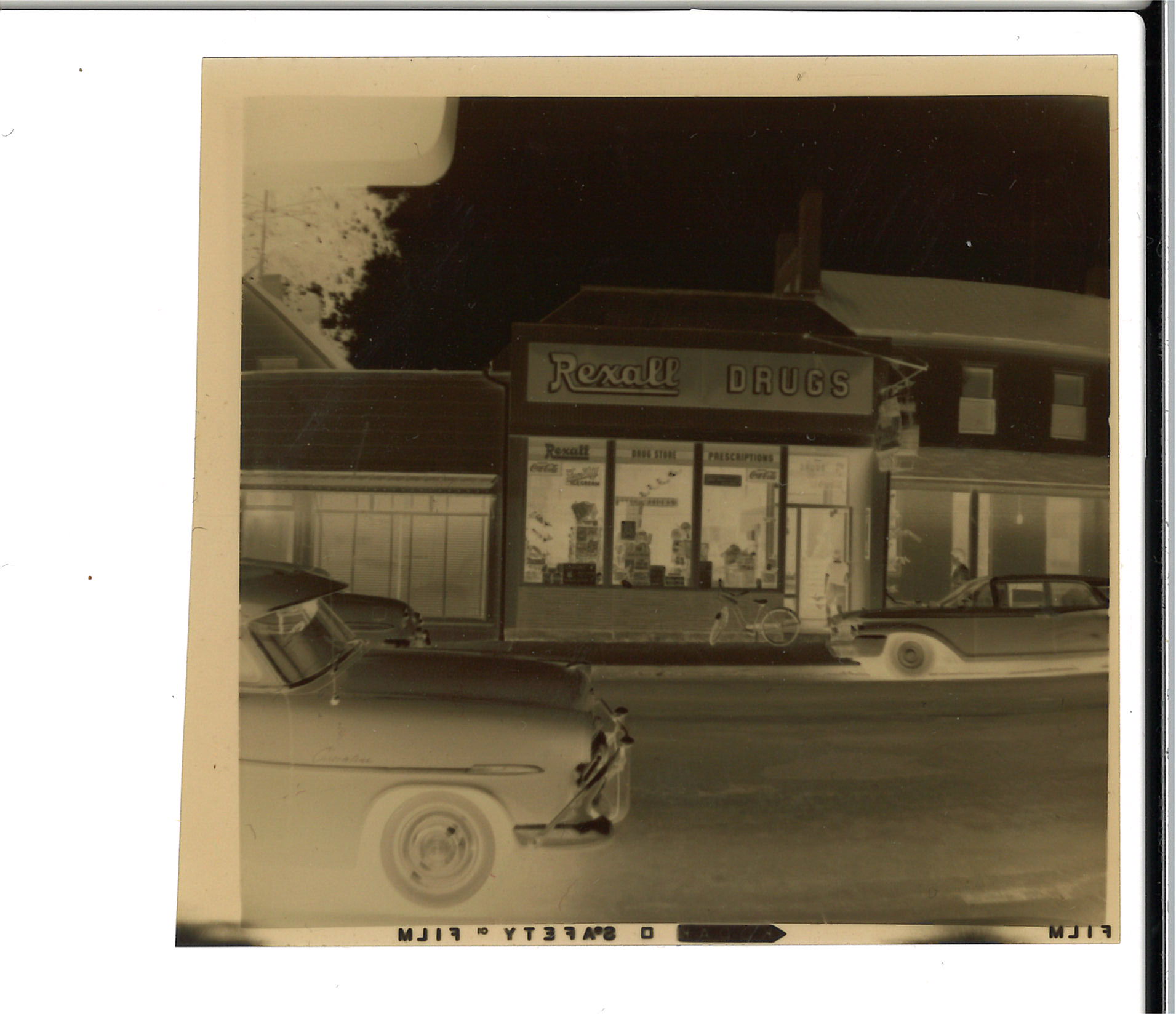 This photo shows the town’s 5-10 variety store and is the current-day building housing Emporium Wines & Underdog Cafe. To the left of the building, now an outdoor seating area, there appears to be a driveway. To the right of the building, there is another driveway, which is the location of the building that currently houses Pangea. Parked out front of the building is a Studebaker Hawk car, and the photo was taken from the current-day Tom’s Market parking lot.