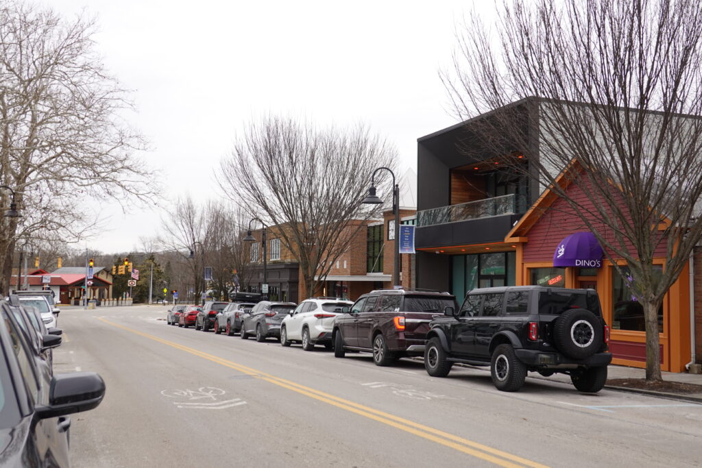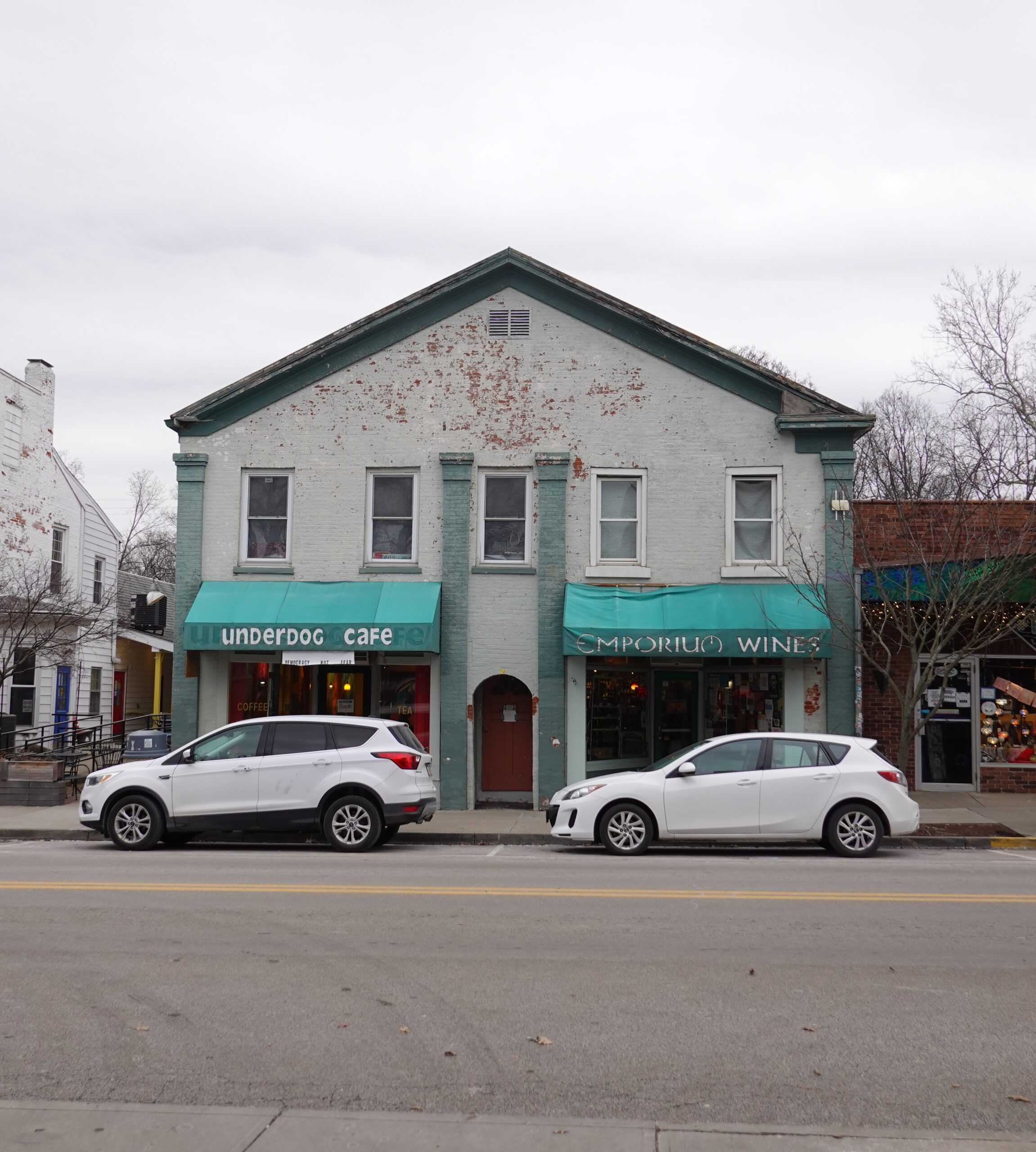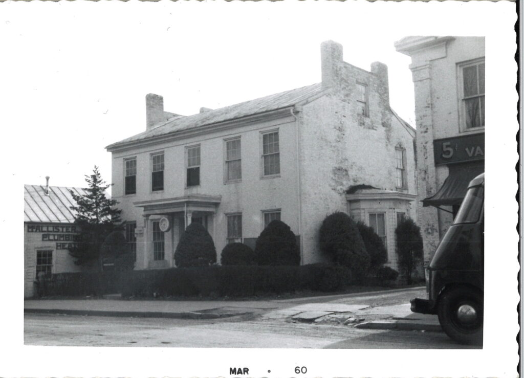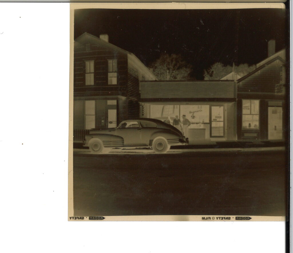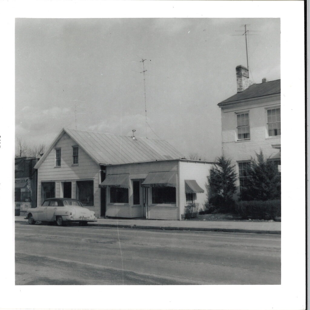 This photo shows the town’s 5-10 variety store and is the current-day building housing Emporium Wines & Underdog Cafe. To the left of the building, now an outdoor seating area, there appears to be a driveway. To the right of the building, there is another driveway, which is the location of the building that currently houses Pangea. Parked out front of the building is a Studebaker Hawk car, and the photo was taken from the current-day Tom’s Market parking lot.