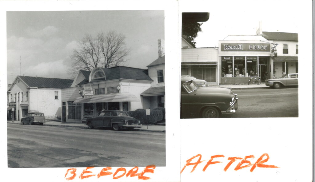 This file contains a before and an after image of Furay Rexall Drugs, possibly to document renovations made to the building. The writer of the words “before” and “after” on the photos themselves is unknown. The building in the “after” photo is the same as today and now houses Glen Garden Gifts.