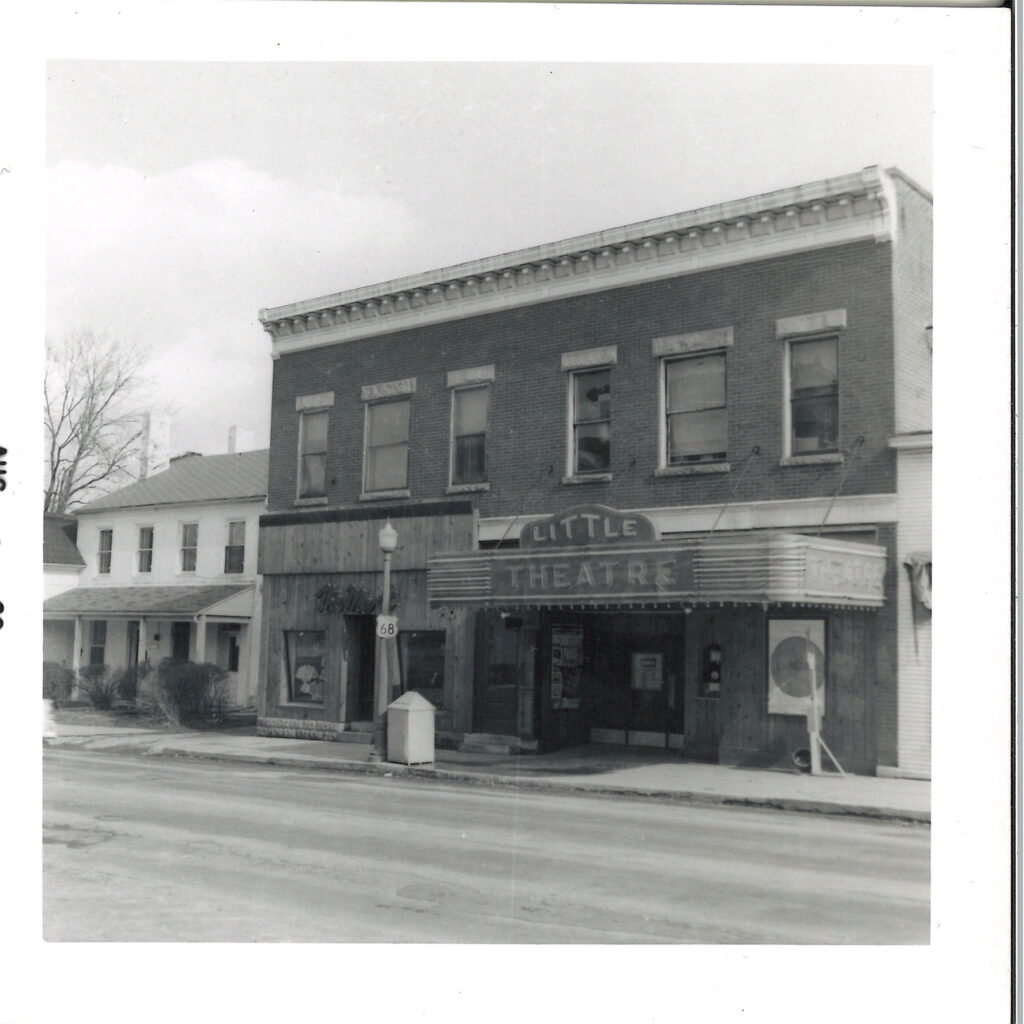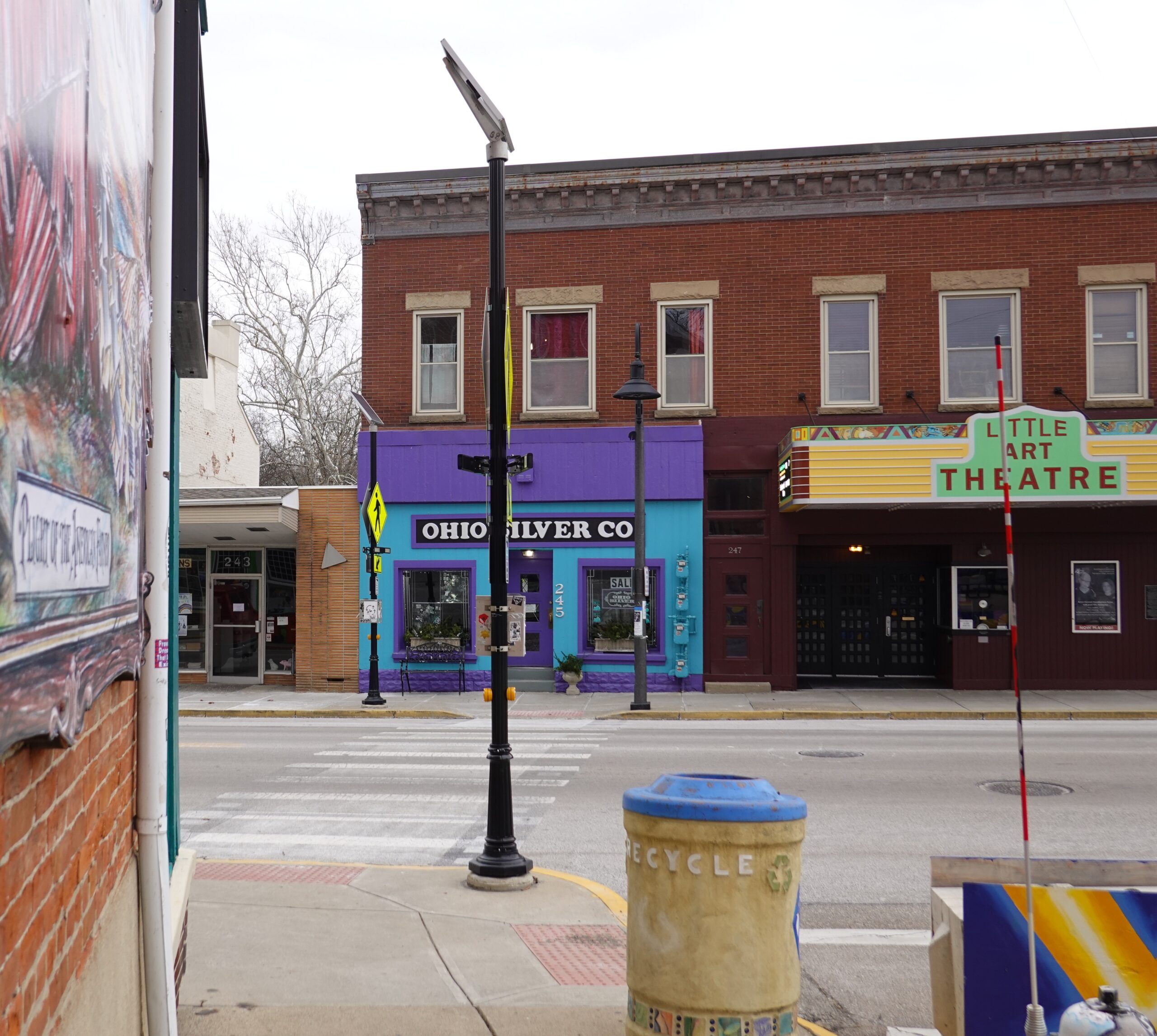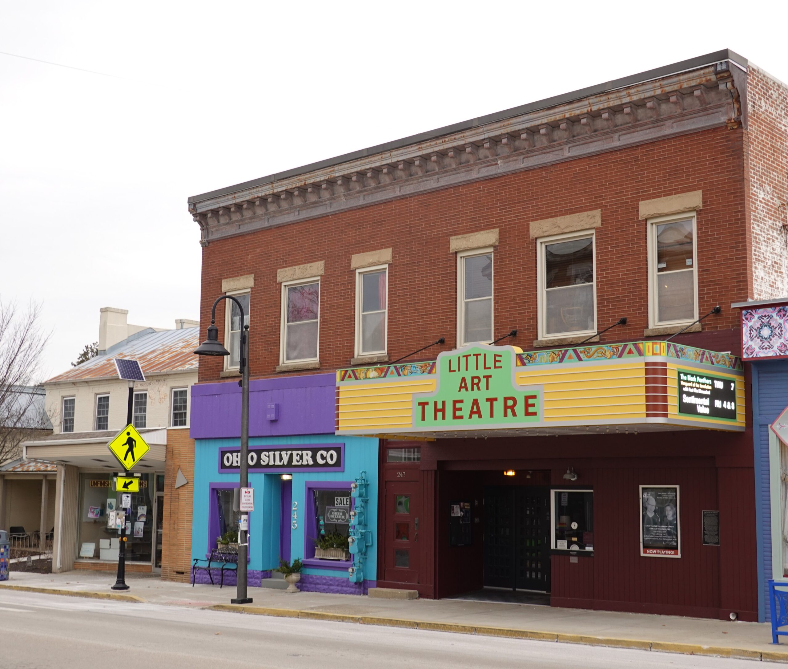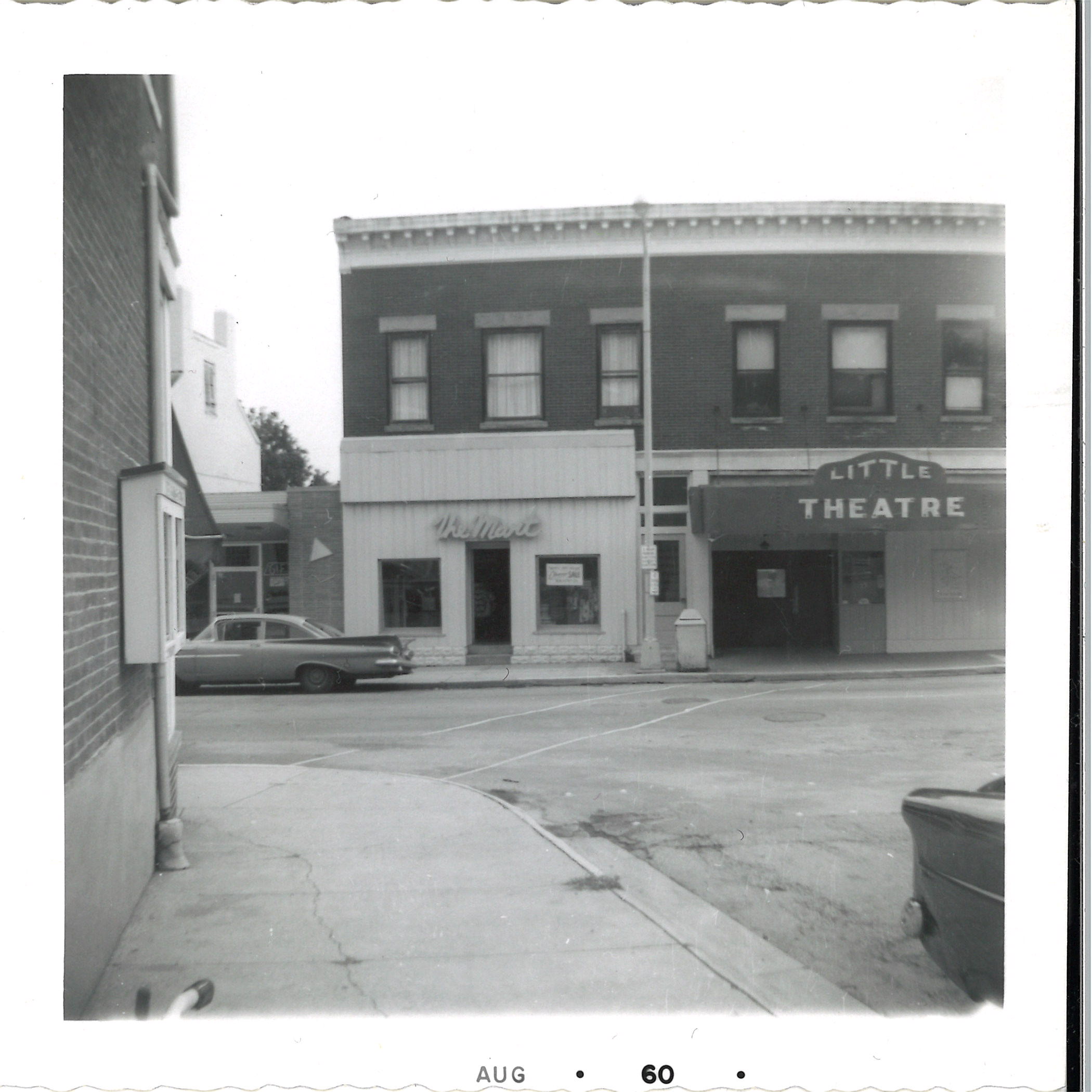 This photo depicts a clothing store called The Mart, now the building in which Ohio Silver Co. operates, and the Little Art Theatre. The Little Art Theatre’s marquee design in this photo is similar to the recently renovated marquee. Based on an old calendar of movies being shown at the theater from August of 1960, the movie poster in this photo could be The Savage Eye.