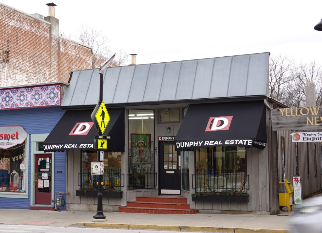 This photo is mostly the same as Image 10, but shows 233 from a different angle and with a different business name. Also, at this time the Yellow Springs News was operating out of the same building and their sign can be seen to the left of the awning.