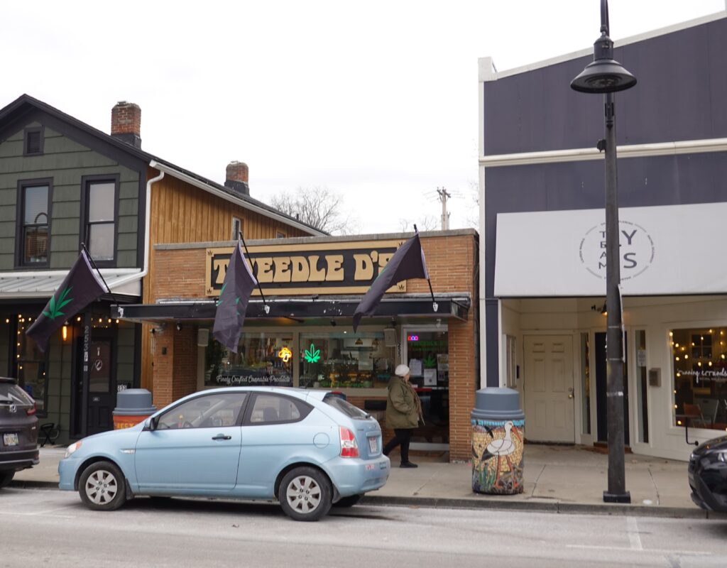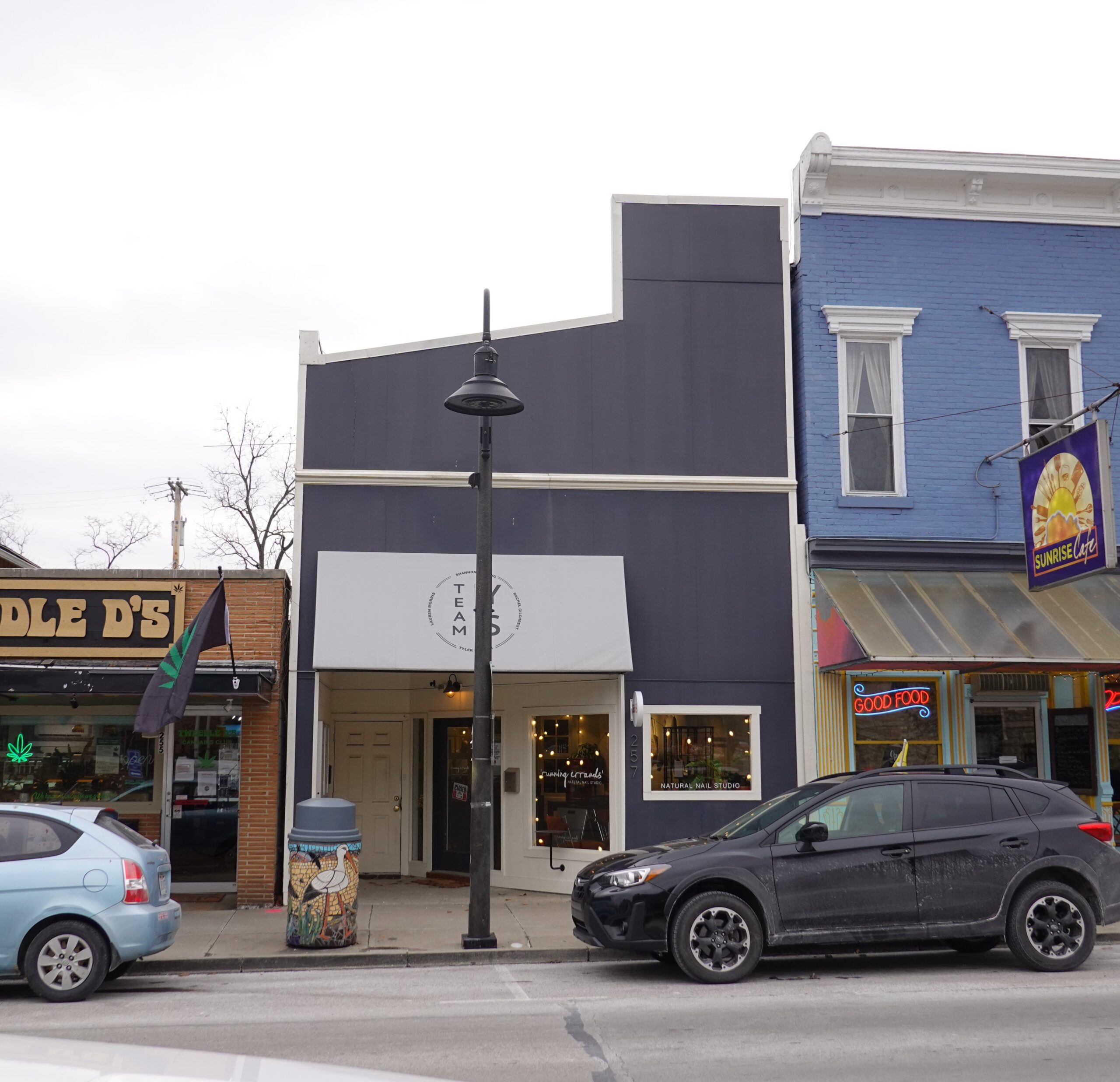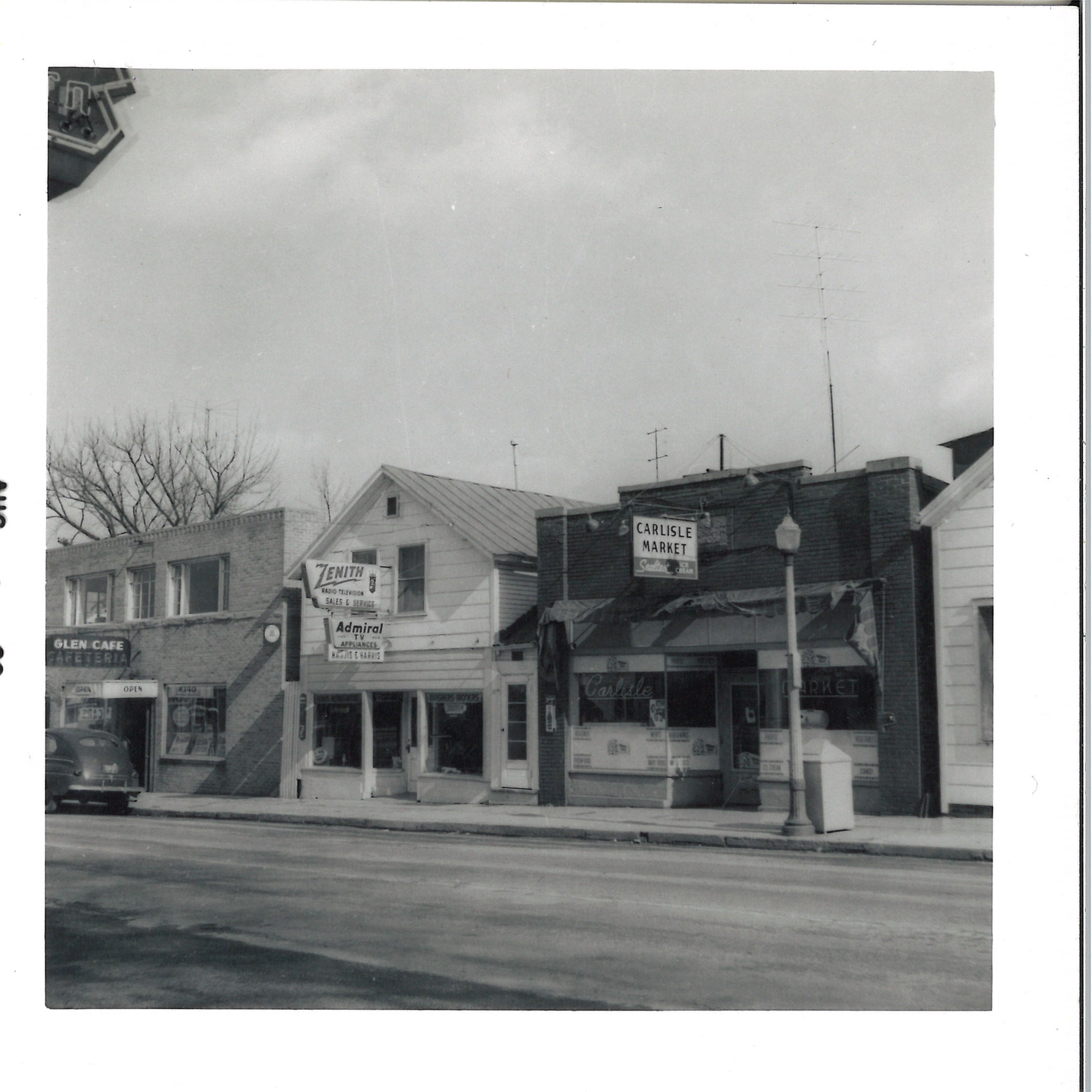 This image depicts some similar businesses to Image 3, but with slightly different names or signage. This is the only image that shows Carlisle Market. Today, these two buildings would encompass the entirety of the YSCU and part of the building located at 221 Xenia Ave., which is owned by Iron Table Holdings LLC.
