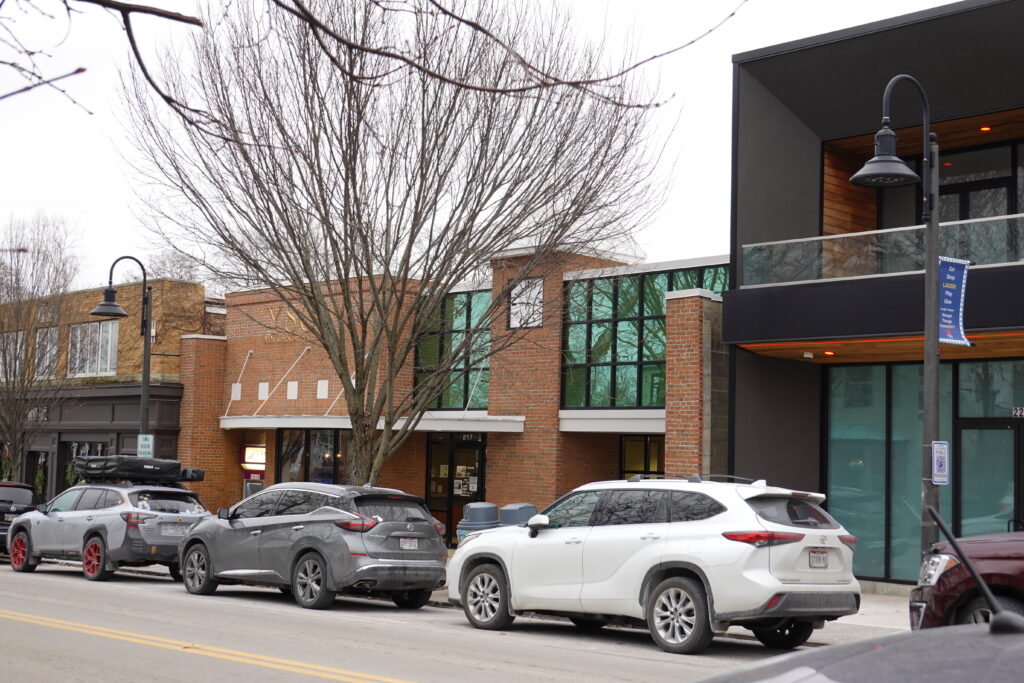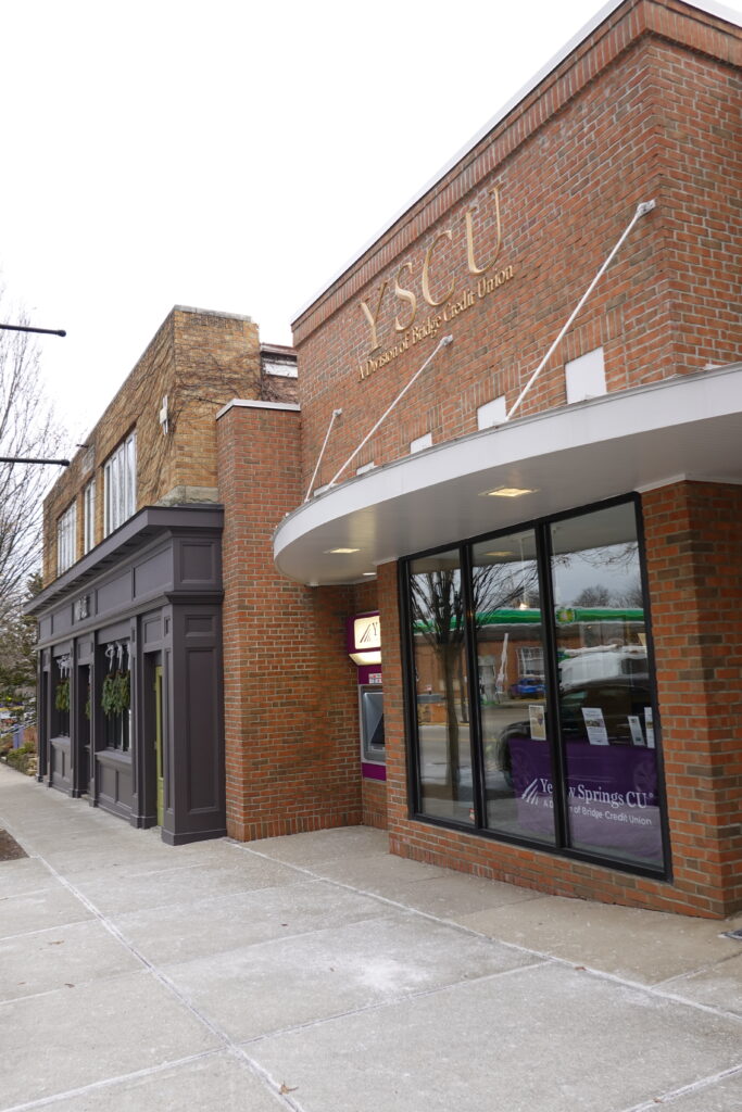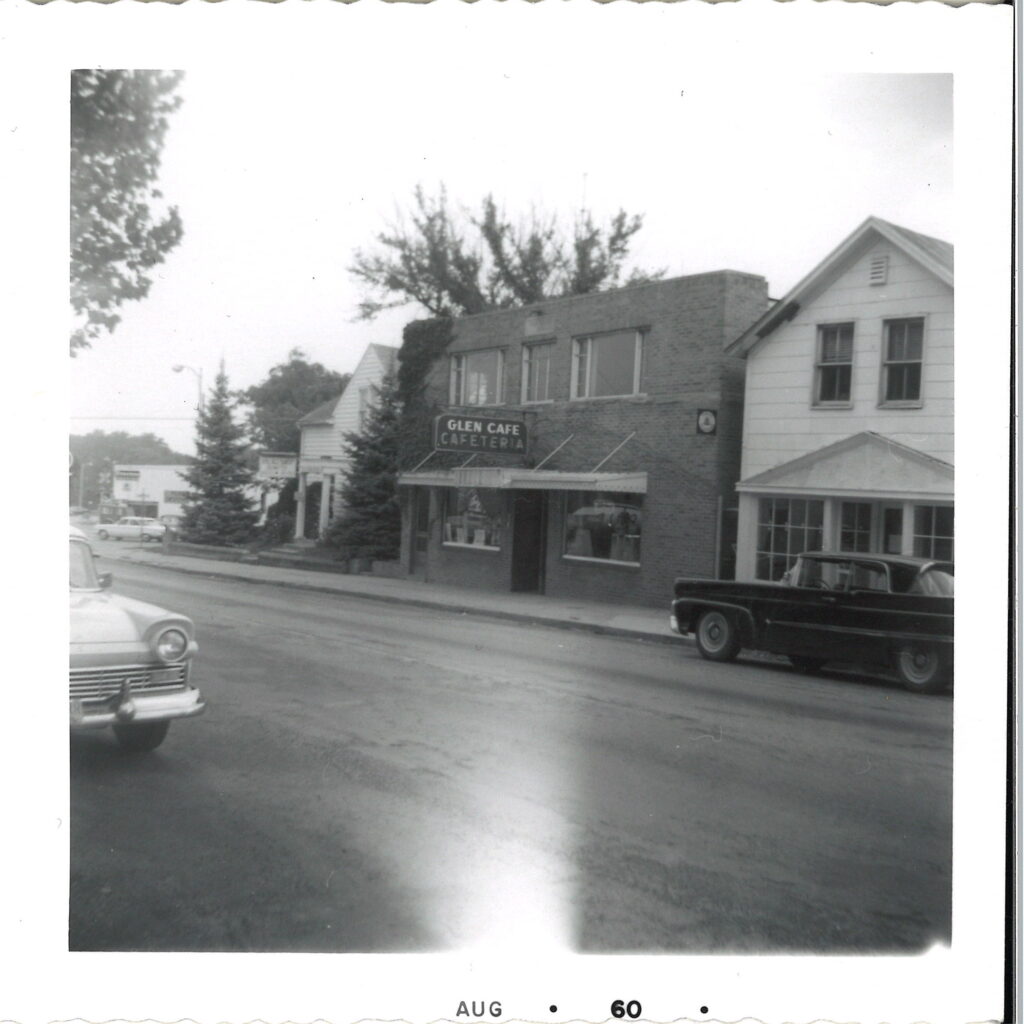 This image focuses on the building that currently houses the Winds Cafe. The building from the last image is seen to the left of the Glen Cafe, though this time with a sign. If you look very closely at the sign, you can make out the words “Village Bakery” and “Donuts”. The building to the right of the Glen Cafe doesn’t seem to be occupied by anything and is the current-day location of Yellow Springs Credit Union (YSCU).