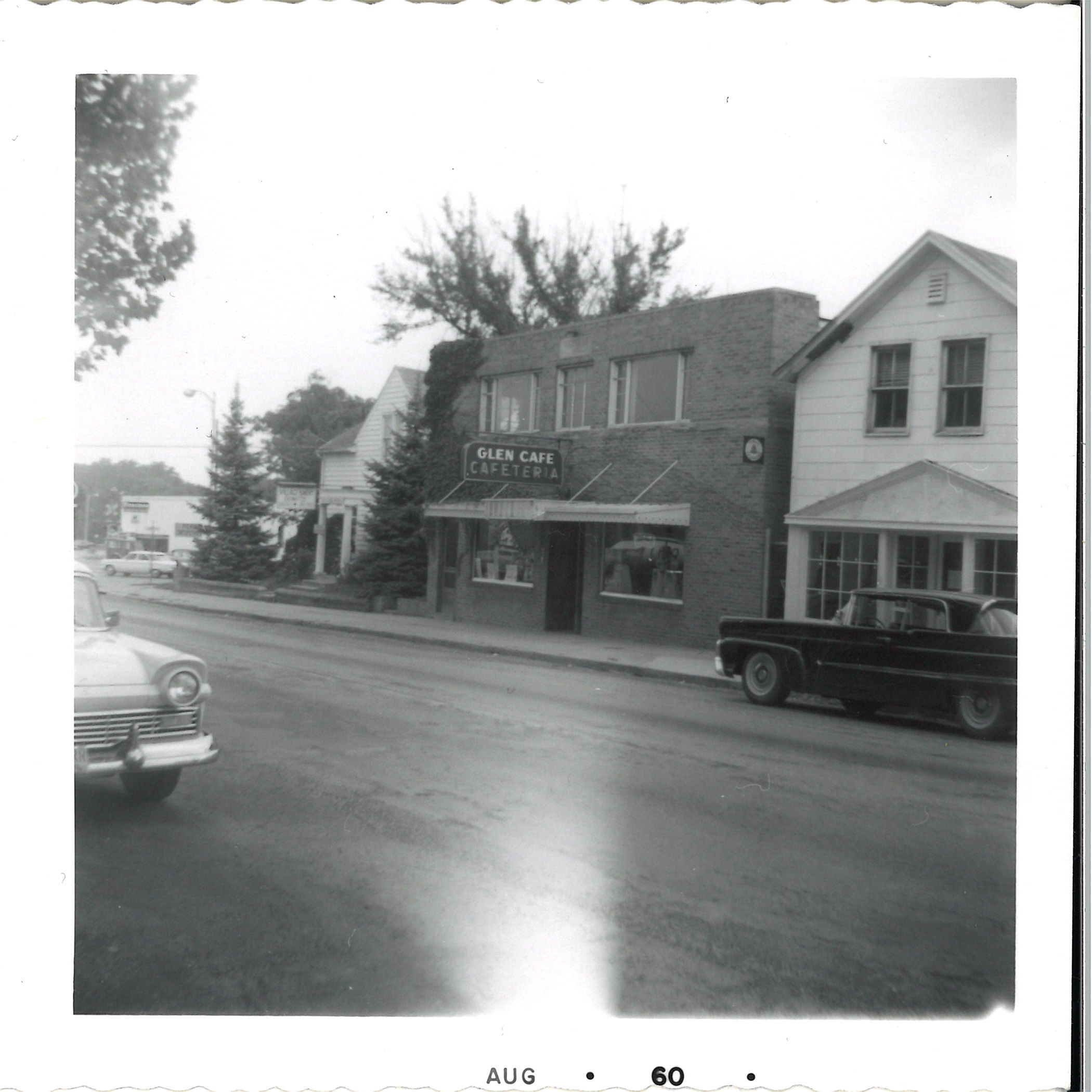 In a wide view of Xenia Ave., this photo shows Glen Cafe, Model Dry Cleaning & Laundry, the multi-business building, and McAllister Plumbing & Heating. Also pictured is a truck with the Carling name, most likely a Carling beer delivery truck.