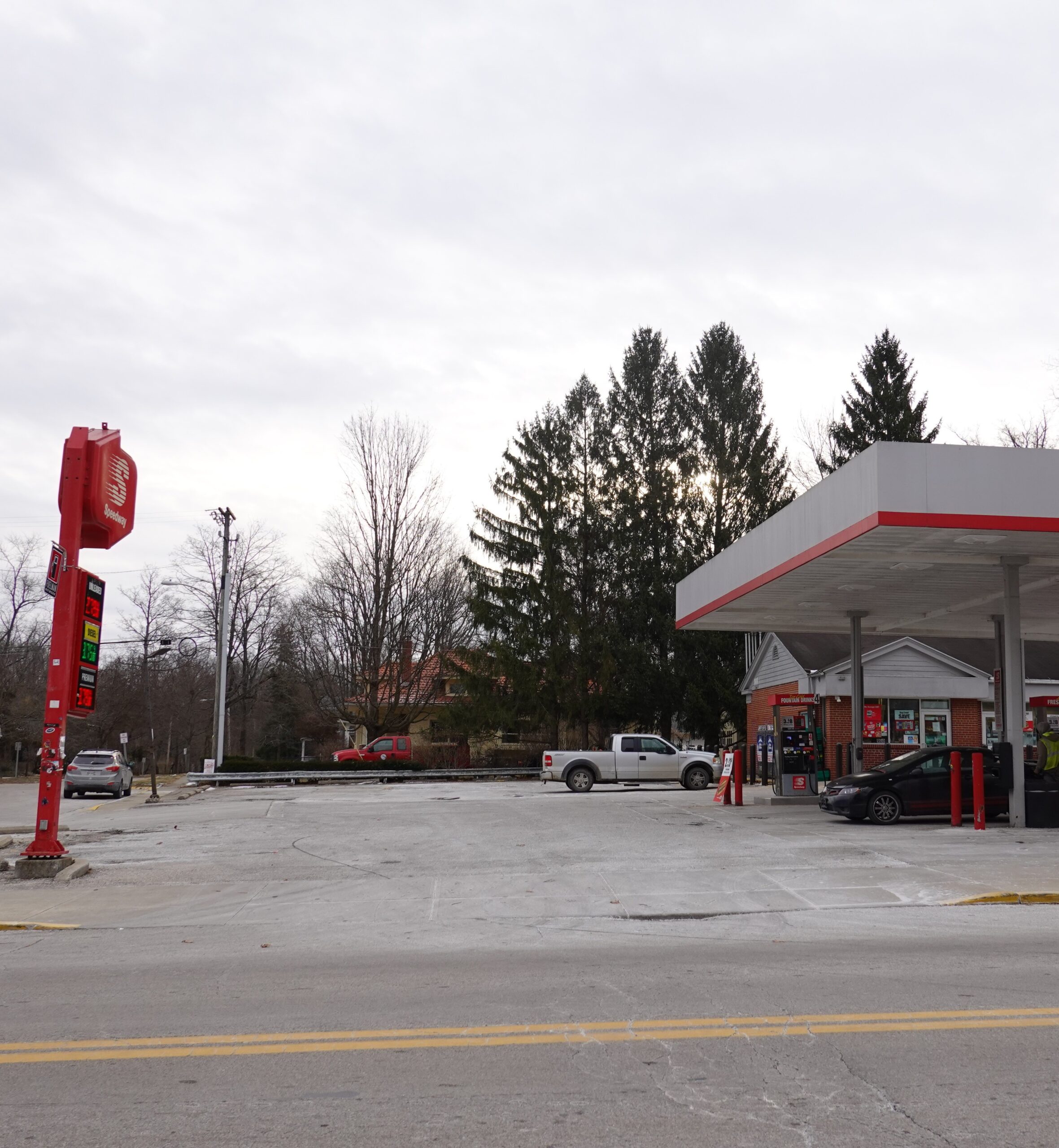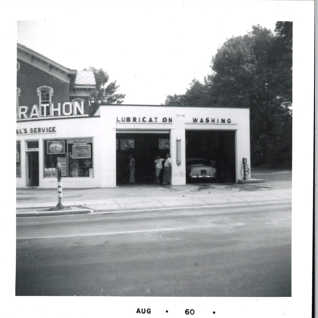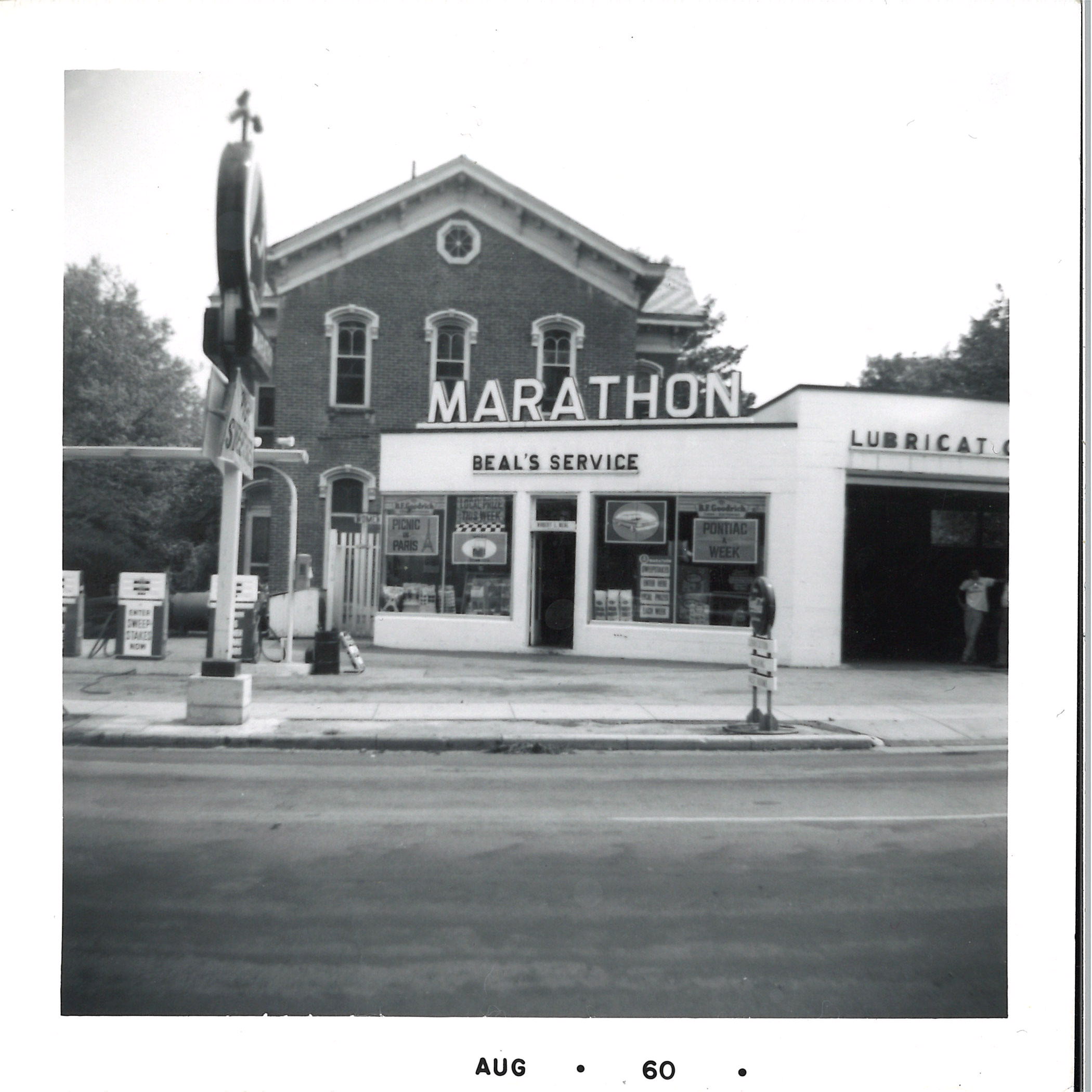 Beal’s Service Marathon sits where today’s Speedway does. Visible in this photo are several ads and promotions in the window of the station.