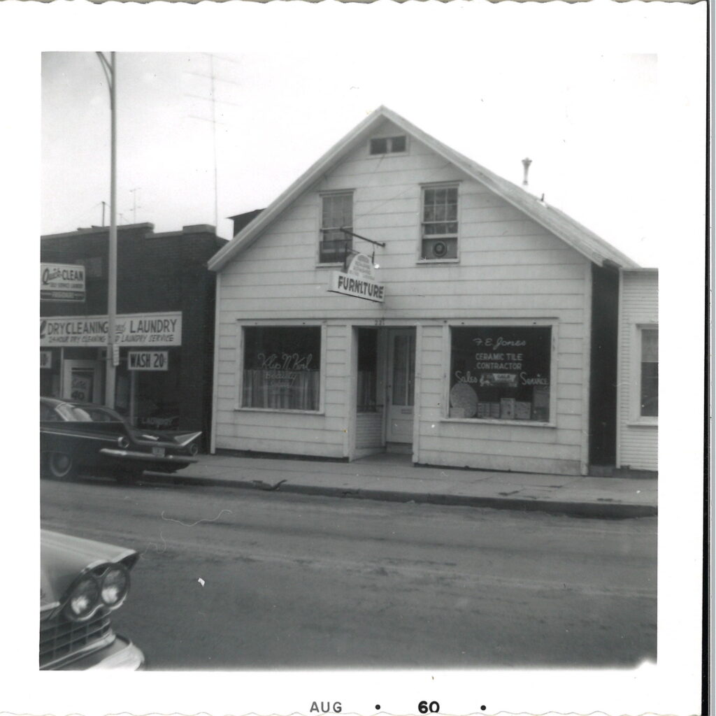 In the image, this building housed three different businesses at once: a furniture store, Klip ‘N Kurl Beauty Shoppe, and F.E. Jones Ceramic Tile Contractor. Today, this space is occupied by the Iron Table Holdings LLC building.