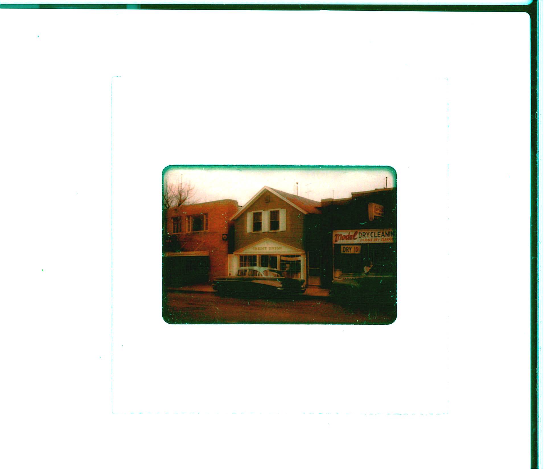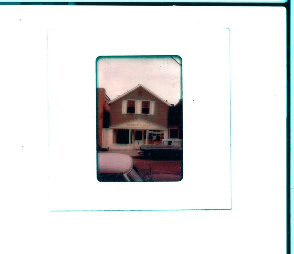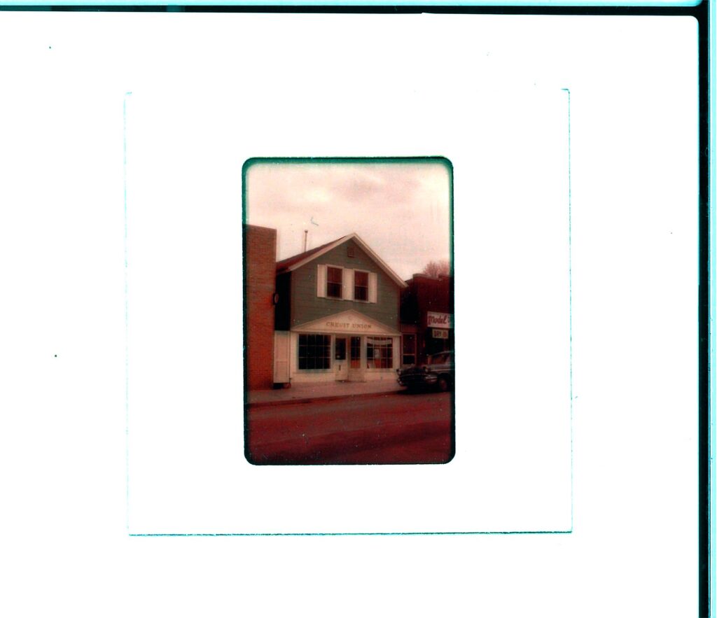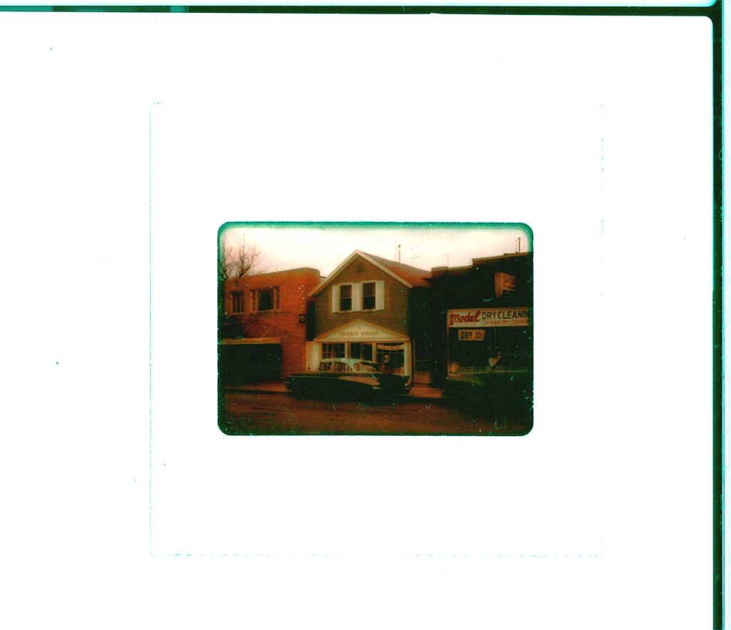The building pictured in this image takes up part of the space currently occupied by the YSCU today. In the window of the building, a banner reading “Tuckabuckadayaway” can be seen, which most likely advertised for the Tuckabuckadayaway Toledo Home Federal Savings and Loan Association.
