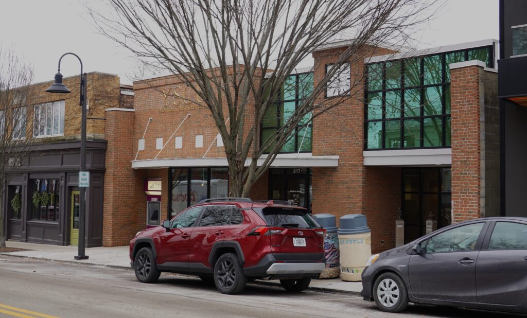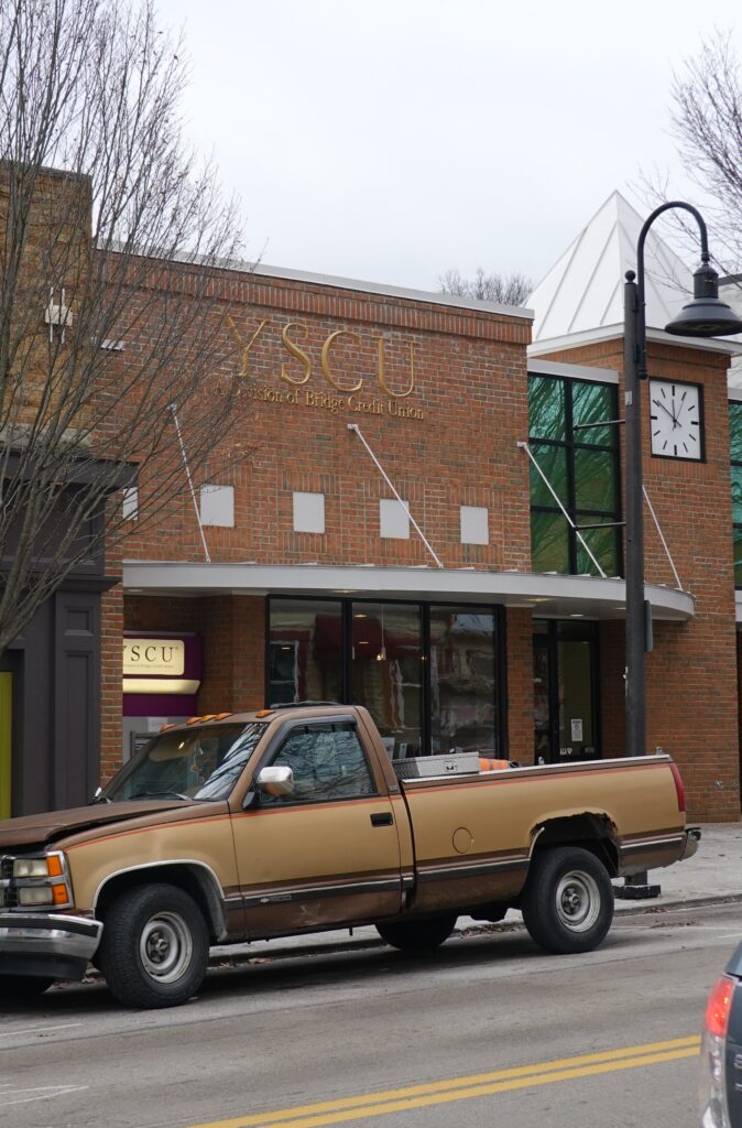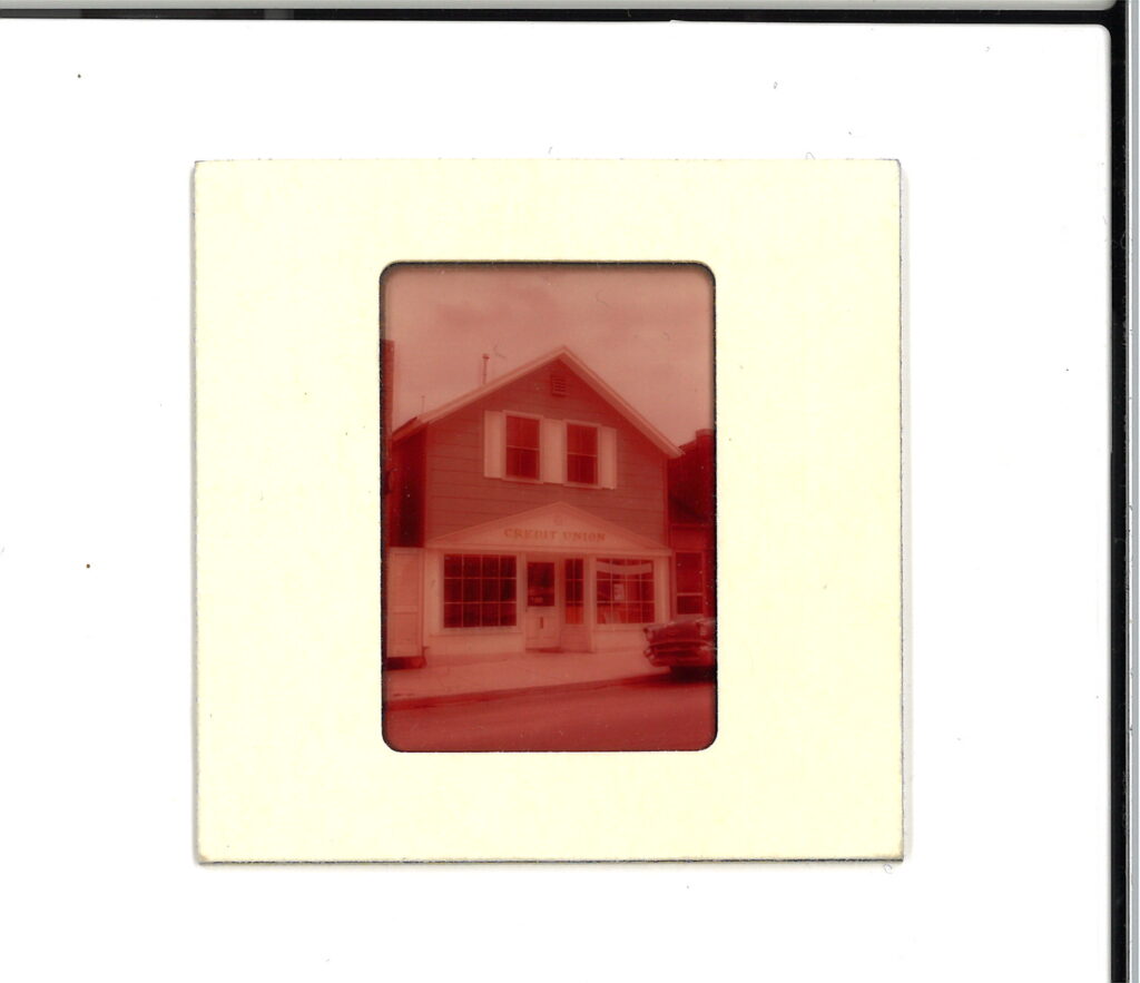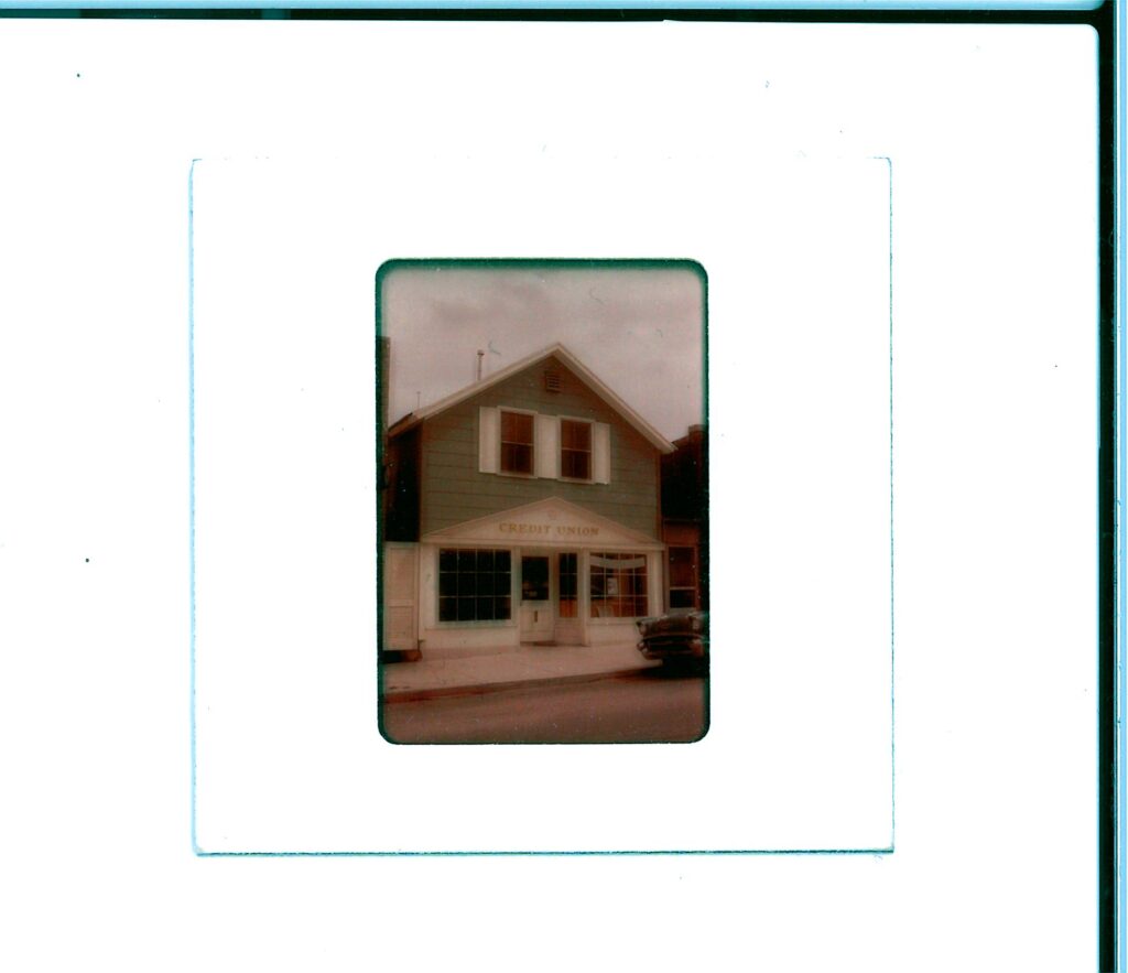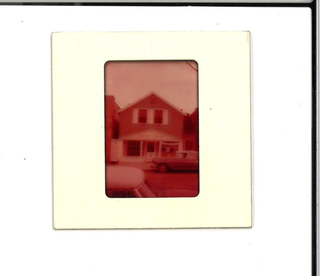 The building pictured in this image takes up part of the space currently occupied by the YSCU today. In the window of the building, a banner reading “Tuckabuckadayaway” can be seen, which most likely advertised for the Tuckabuckadayaway Toledo Home Federal Savings and Loan Association.