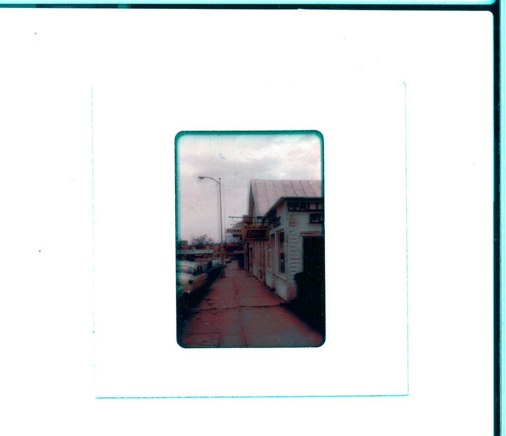 A view of the same stores, but at an angle where you can see all the way to what appears to be the John Bryan Center, though at the time this photo was taken, it would have been Bryan High School.